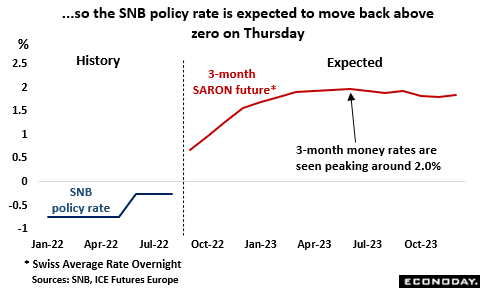 The SNB’s unexpectedly large 50 basis point hike in its benchmark rate to minus 0.25 percent in June was widely seen as indicative of a major shift in policy and proof of the central bank’s desire to get interest rates back into positive territory. With this in mind, the market call is for another increase of at least the same magnitude and quite possibly 75 basis points, putting the rate at 0.25 percent or 0.50 percent at Thursday’s Monetary Policy Announcement (MPA). Significantly, the last tightening occurred with the Swiss franc trading close to what investors thought to be the central bank’s pain threshold and was interpreted as evidence of the bank giving up on its efforts to weaken its currency. Since June, persistently heavy capital inflows have caused the franc to strengthen still further and the EUR/CHF cross-rate now seems to be very firmly established below parity. The SNB continues to make warning noises about excessive appreciation and financial markets remain alert to a possible surprise burst of intervention, but increasingly the sense is that a strong franc is now officially welcomed as a means of helping to keep a lid on inflation.