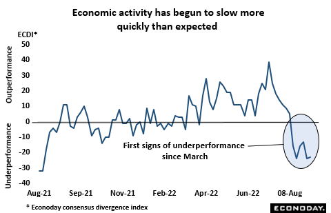 In fact, following half a year of surprising strength, the latest data have warned that the slowdown might be rather more abrupt than anticipated. The Swiss ECDI, which measures how recent economic activity in general has performed versus market expectations, slipped below zero in mid-August. Should it remain there, the signs would be that developments in Ukraine might be having a more negative effect than previously supposed. And if so, it might just temper the aggressiveness with which the SNB delivers any future interest rate hikes.
