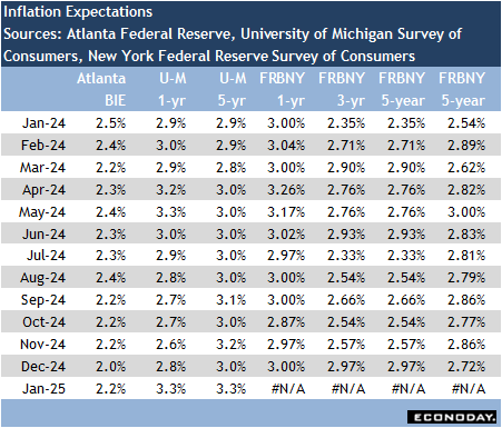 The University of Michigan 5-year inflation expectations measure is up three-tenths to 3.3 percent in January from December, and has broken out of the range of 2.9-3.2 percent that has dominated since October 2022. This is above the 3.2 percent in November 2023 and November 2024. In fact, this is the highest in the current inflationary episode and will put the FOMC on alert regarding its credibility as an inflation fighter.