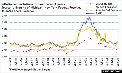 Note that in January, the Atlanta Fed year-ahead business inflation expectations report had a two-tenths increase to 2.2 percent, rising from 2.0 percent in December which was the lowest since 1.9 percent in December 2020. The implication is that businesses do expect the Fed to bring inflation down, but maybe not as quickly as previously expected. The University of Michigan 1-year inflation expectations measure is up five-tenths to 3.3 percent in January and is its highest since 33 percent in May 2024. Much of that is probably due to sticker shock on prices for eggs and poultry related to the outbreak of avian flu. Cut it does indicate that consumers see significant erosion of improvements in inflation.