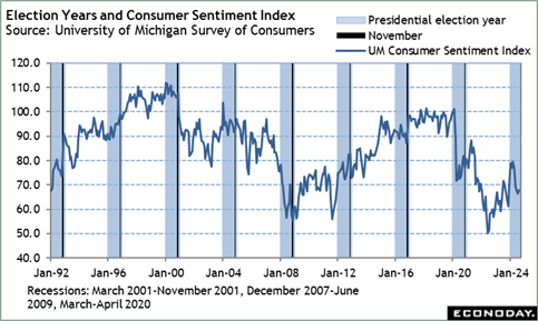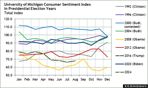 In looking at the behavior of the University of Michigan consumer sentiment index, if there is any constant, it is that the months before an election tend to raise a sense of uncertainty that eases once the election is held. There are notable exceptions like the contested outcome of the 2000 Bush-Gore race or the divisive reaction to the Trump-Biden contest in 2020. When it looked like there would be a rematch between Donald Trump and Joseph Biden in 2024, consumers were increasingly gloomy, although there were economic developments at the time that should also be taken into account like the less hopeful outlook for disinflation and lengthened prospects of a rate cut. As the summer ends, consumers are still feeling relatively pessimistic amid a still highly contentious election environment despite the change in the contest with Kamala Harris.