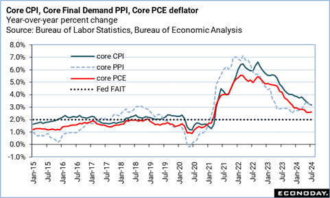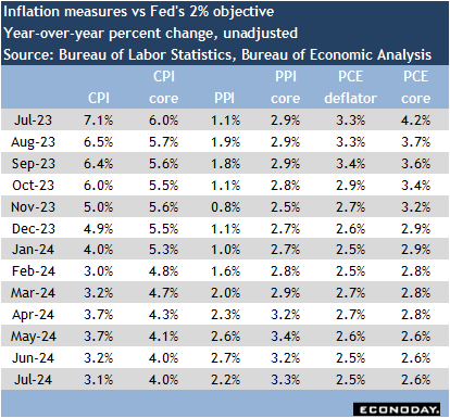 The PCE deflator is the Fed’s preferred measure of consumer inflation due to its broader basket of goods. As of the July data, the PCE deflator is at up 2.5 percent year-over-year and the core PCE deflator is at up 2.6 percent year-over-year. While the year-over-year pace of inflation has been essentially unchanged for the past three months, it hasn’t worsened and it remains within sight of the Fed’s 2 percent flexible average inflation target. Adding to this is evidence in other inflation reports – notably the CPI – that some of the more stubborn sources of inflation like housing and non-housing services are finally seeing an easing in upward price pressures. Fed policymakers can finally say that they have achieved “greater confidence” in success in sustainably bringing down inflation.