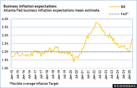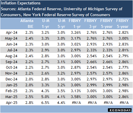 Inflation expectations continue to rise in April as businesses and consumers navigate the choppy waters of the Trump administration’s tariff policy. The reversals of policy probably mean that some of the anticipation of higher prices will ebb in the near future, although it is unclear whether the unease about increased costs will dissipate quickly.