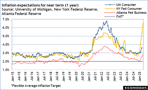 Inflation expectations in the short term (1 year) can be quite volatile and can be downplayed as significant. On the other hand, expectations for the medium term that the FOMC gives more weight are also sharply higher in the last few months. This is where the Fed can see its credibility for fighting inflation eroded. Fed policymakers will have to take this into account in setting policy. It is one more argument for being patient and leaving the fed funds target rate range unchanged at its present 4.25-4.50 percent.