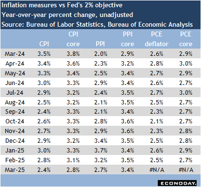 That situation could change in the next week or two depending on the advance estimate of first quarter GDP at 8:30 ET on Wednesday, April 30, the PCE deflator in the report on personal income and spending for March at 10:00 ET on Wednesday, April 30, and the monthly employment report at 8:30 ET on Friday, May 2. The next major reports on inflation and inflation expectations will not be released until after the FOMC meeting.
