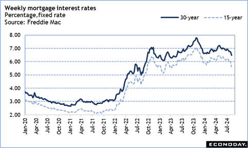 As of the August 8 data, the Freddie Mac rate for a 30-year fixed mortgage rate is down 26 basis points to 6.47 percent from the prior week, reaching its lowest since 6.39 percent in the May 18, 2023 week. The rate for a 15-year fixed rate mortgage is down 36 basis points to 5.63 percent in the August 8 week, below 6 percent for a second week in a row and the lowest since 5.75 percent in the May 18, 2023 week.