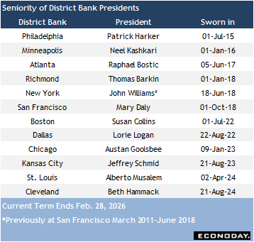 For 2025, the lineup of policymakers that comprise the Federal Open Market Committee (FOMC) looks stable. The normal rotation of voting presidents of the district banks does not include anyone who will be retiring in 2025. Only Philadelphia Fed President Patrick Harker is coming up on mandatory retirement in June 2025. The Philadelphia District does not vote again until 2026.