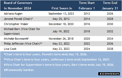 None of the members of the Board of Governors sees an end of term before January 2026. Jerome Powell’s term as Chair runs until mid-May 2026, Philip Jefferson’s term as Vice Chair ends in mid-September 2027, and Michael Barr’s run as Vice Chair for Supervision is until mid-July 2026. There is no mandatory retirement age for the Board of Governors.